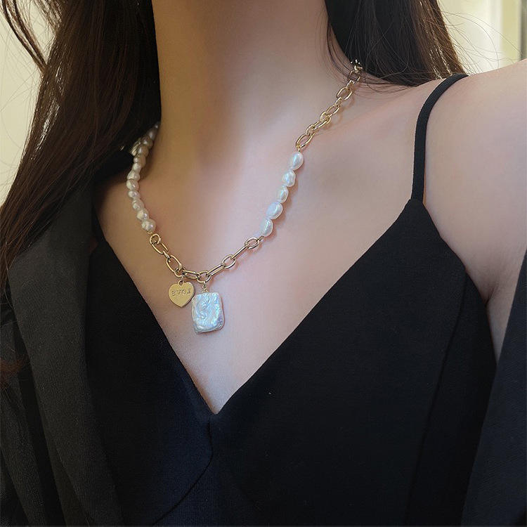 Retro Natural Freshwater Pearl Necklace with Fashionable Simple Temperament Metal Heart-Shaped Pendant European Style