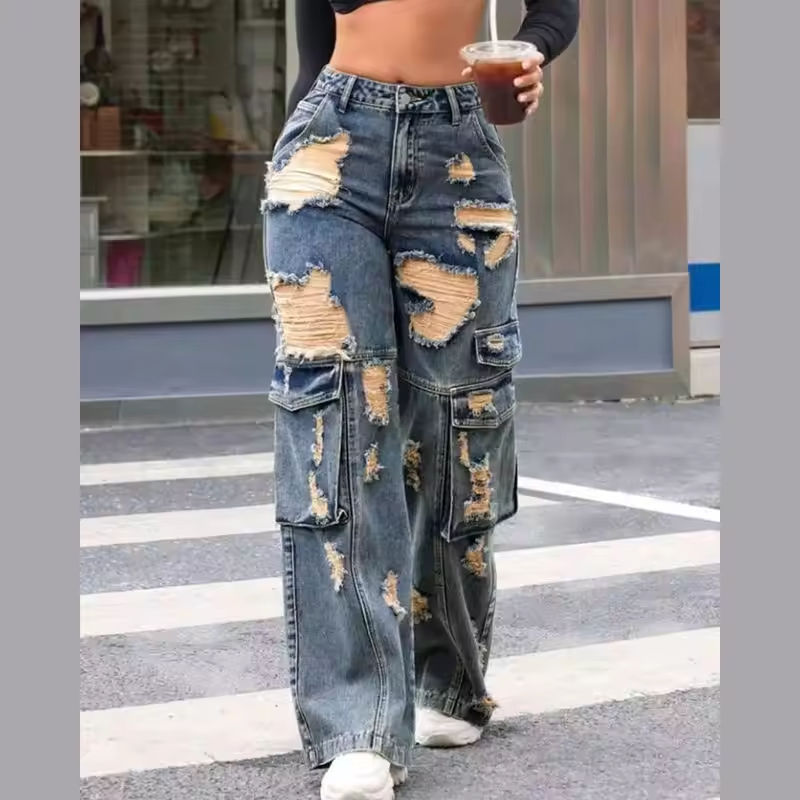Retro Streetwear Denim Trousers Straight Wide Leg Patchwork Embroidery Letters Baggy Pants Jeans Women