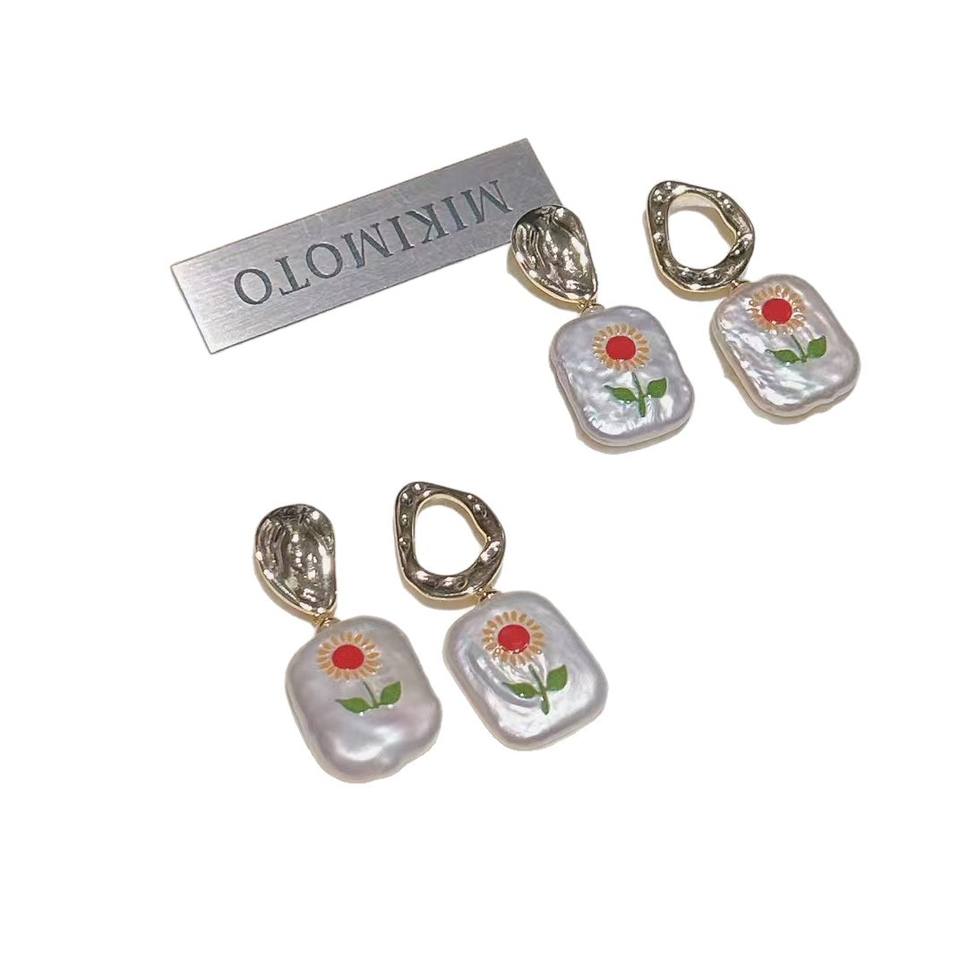 Retro Style Block Baroque Freshwater Pearl Earrings Oil Painting Sunflower Inspired Celebrity Jewelry Pendants and Earrings