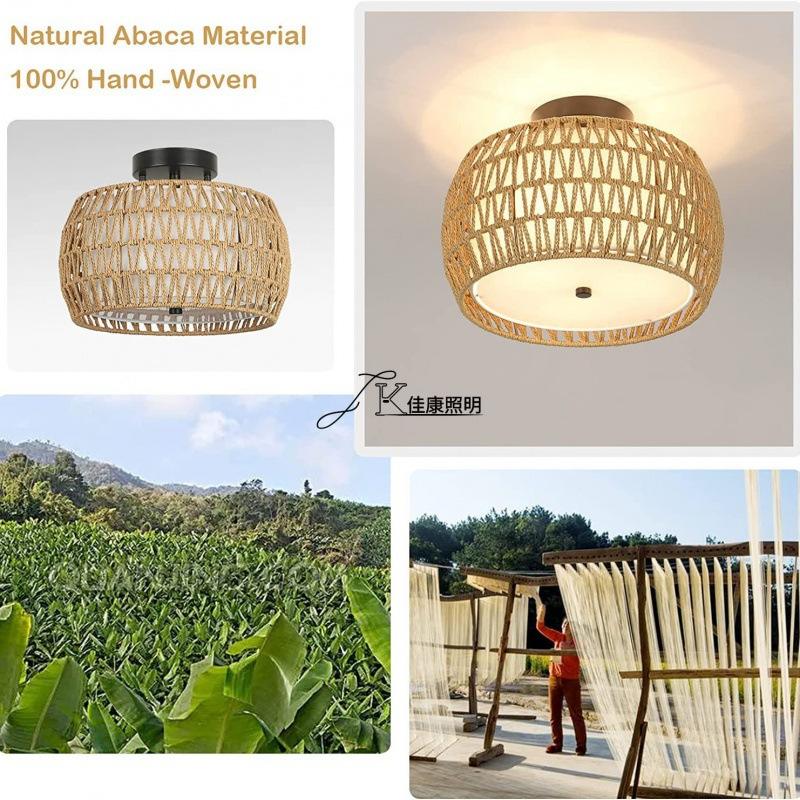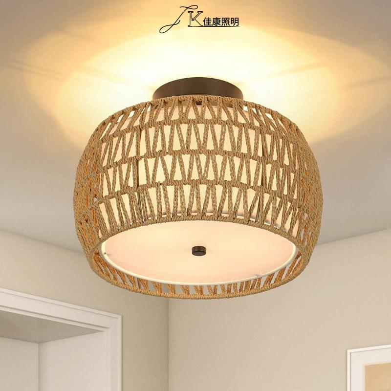Retro Woven Rattan Ceiling Light Round Incandescent Hardwired Living Room And Dining Room Lighting Fixture