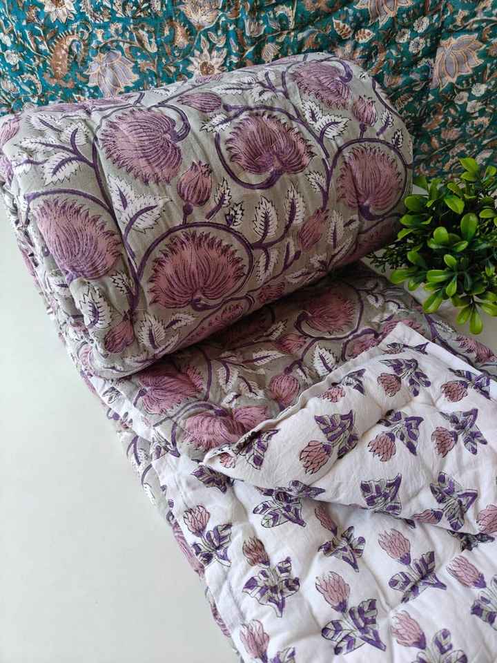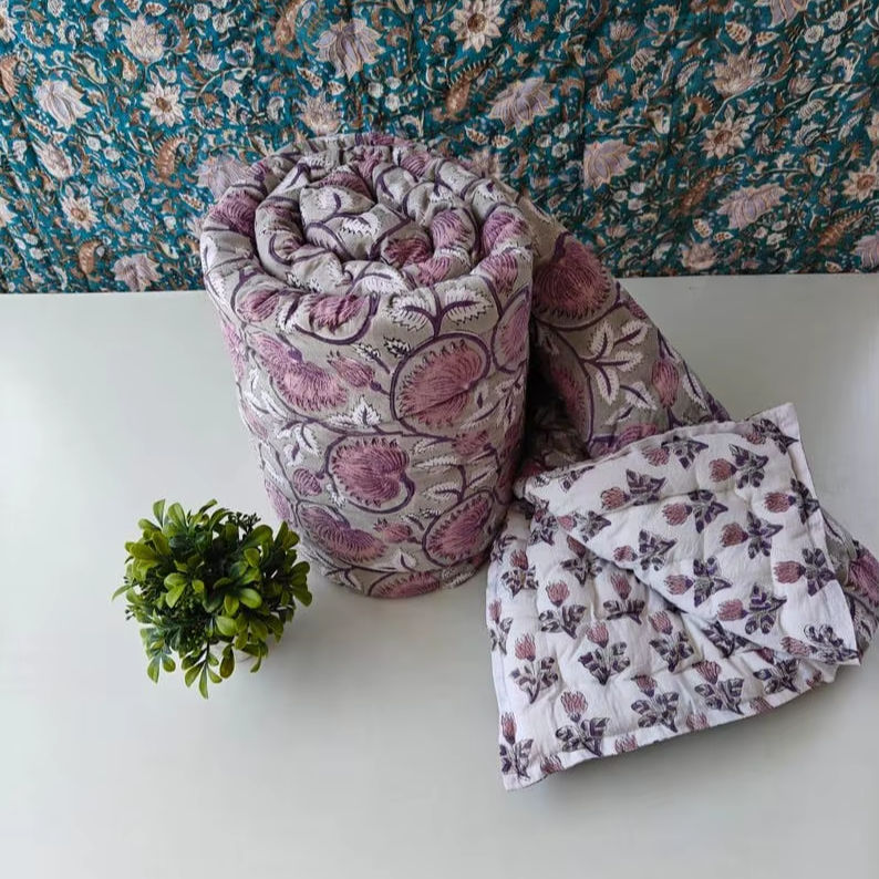 Reversible Hand Block Printed Cotton Razai Quilt Luxury Bedspread