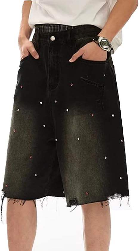 Rhinestone Baggy Jeans Shorts Wide Leg Washed Denim Shorts Grunge Ripped Hip Hop Street wear