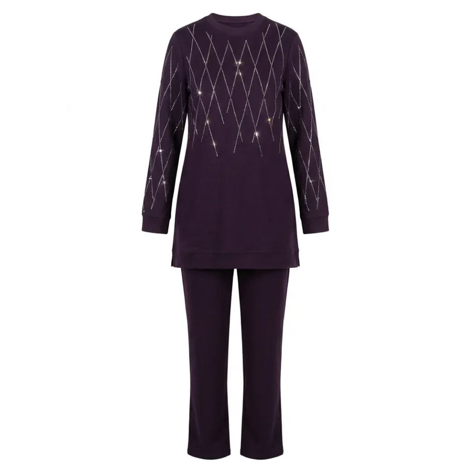 Rhinestone Pattern Modest Tracksuit Women Embroidered Long Top and Straight Pants Set Muslim Evening Loungewear