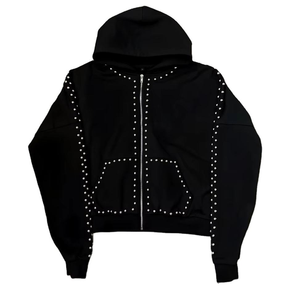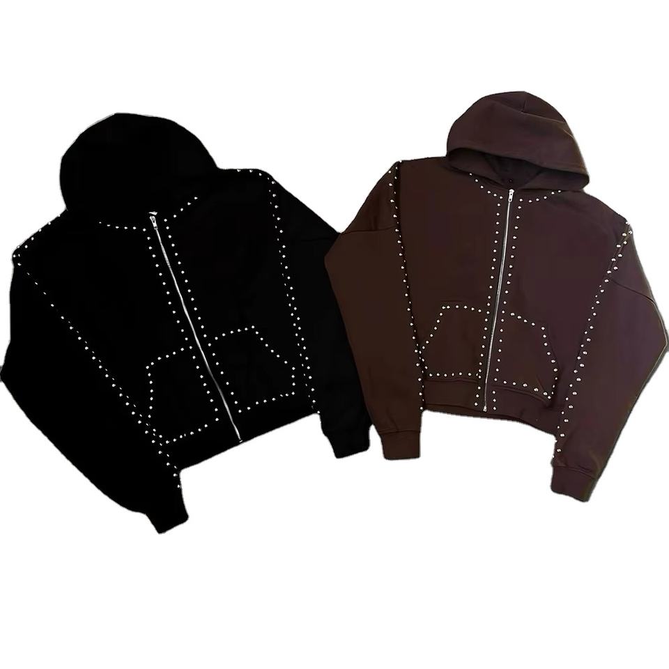 Rhinestone Studded Zip Up Hoodie Custom Design Logo Oversized Streetwear for Men Hoodies Heavyweight 100% Cotton Fleece OEM ODM