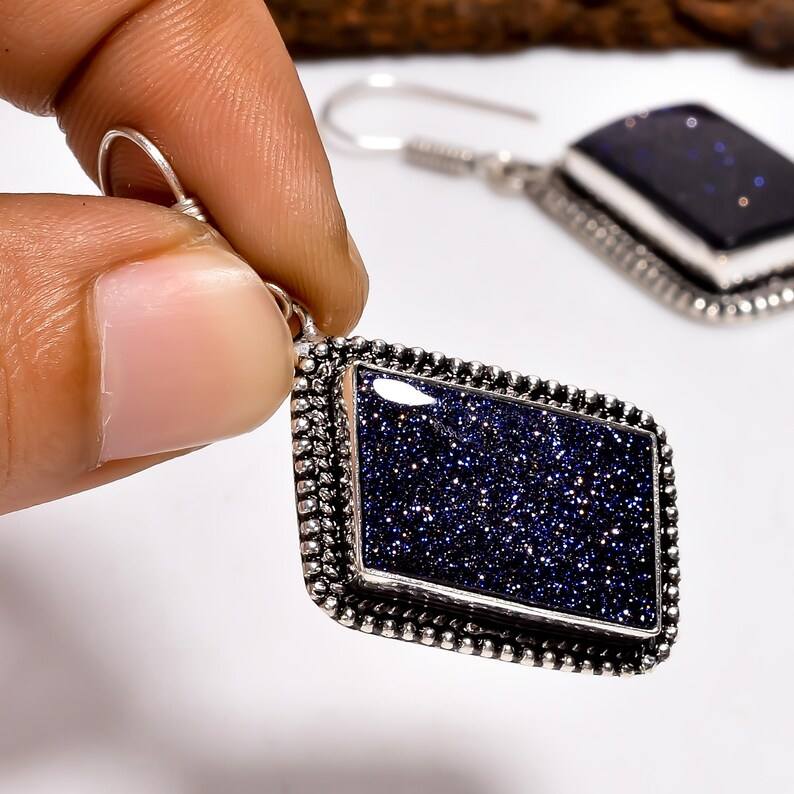 Rhombus Blue Sandstone Dangle Earrings Handmade Sterling Silver Boho Gemstone Jewelry Gift For Women