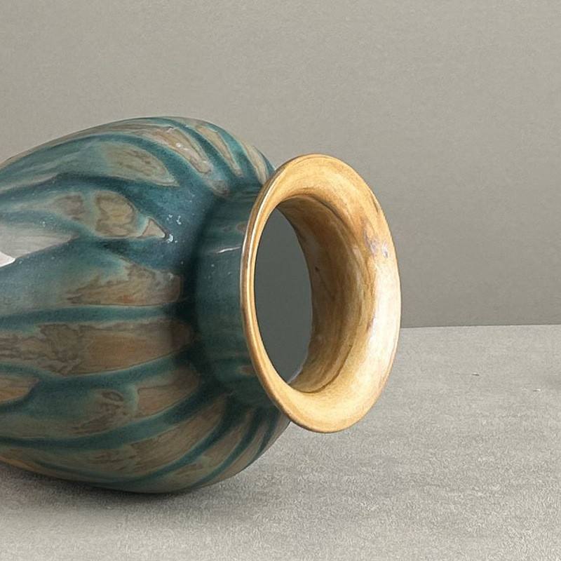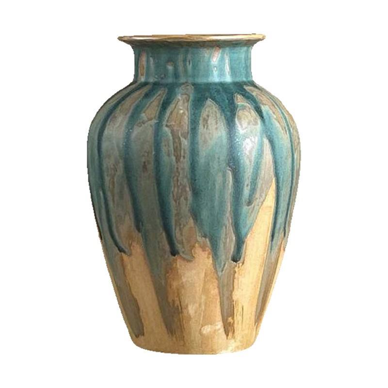 Ribbed Drip-Glaze Ceramic Vase - Artisanal Teal & Amber Decorative Vessel for Home