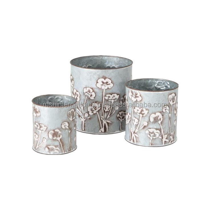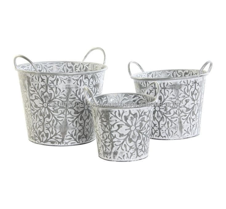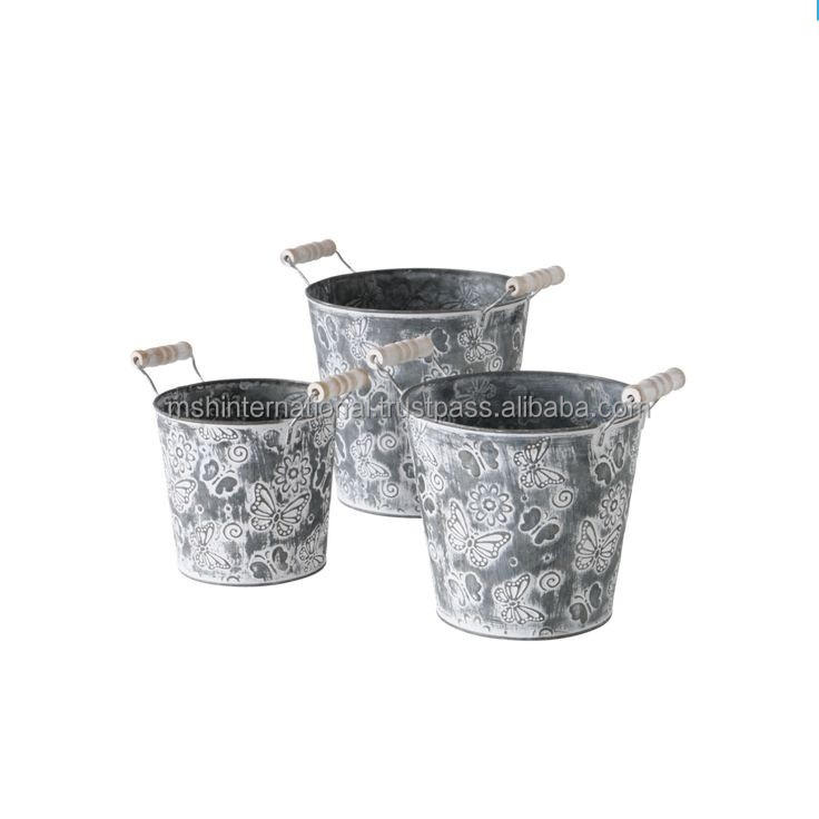 Ribbed Galvanized Metal Bucket Planter White Patina Finished Galvanized Metal Planter Round Shape with Wood Handle