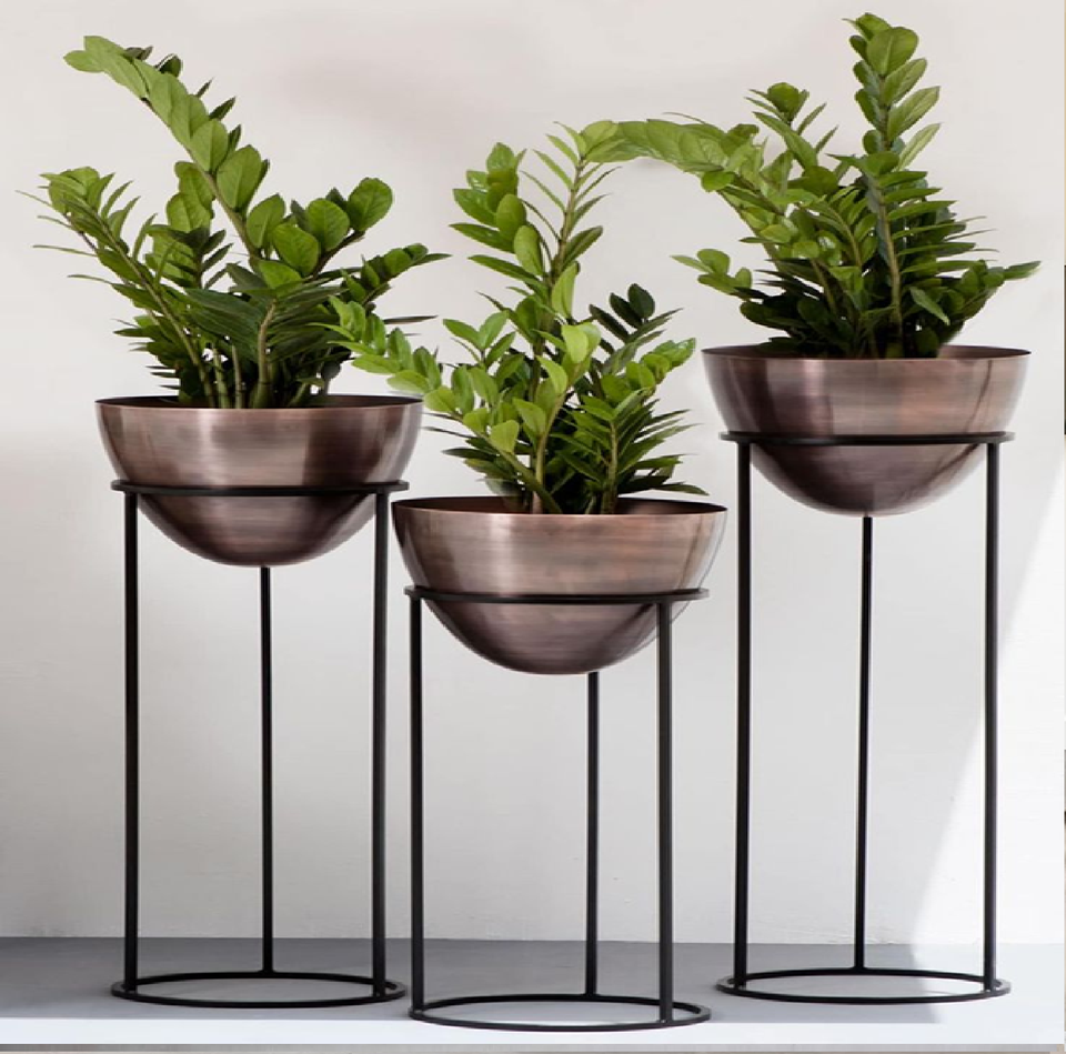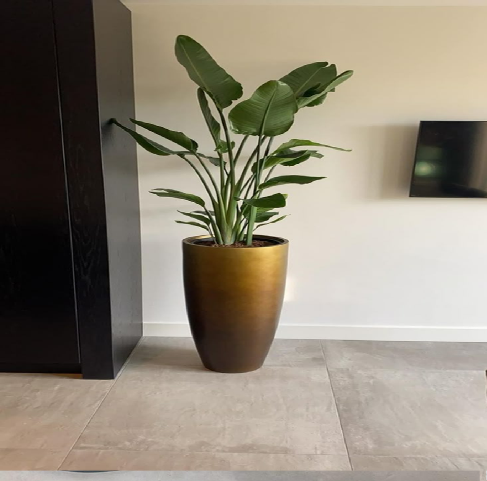 Ribbed gold metal planters, textured design, antique finish, versatile pots, available at wholesale prices.
