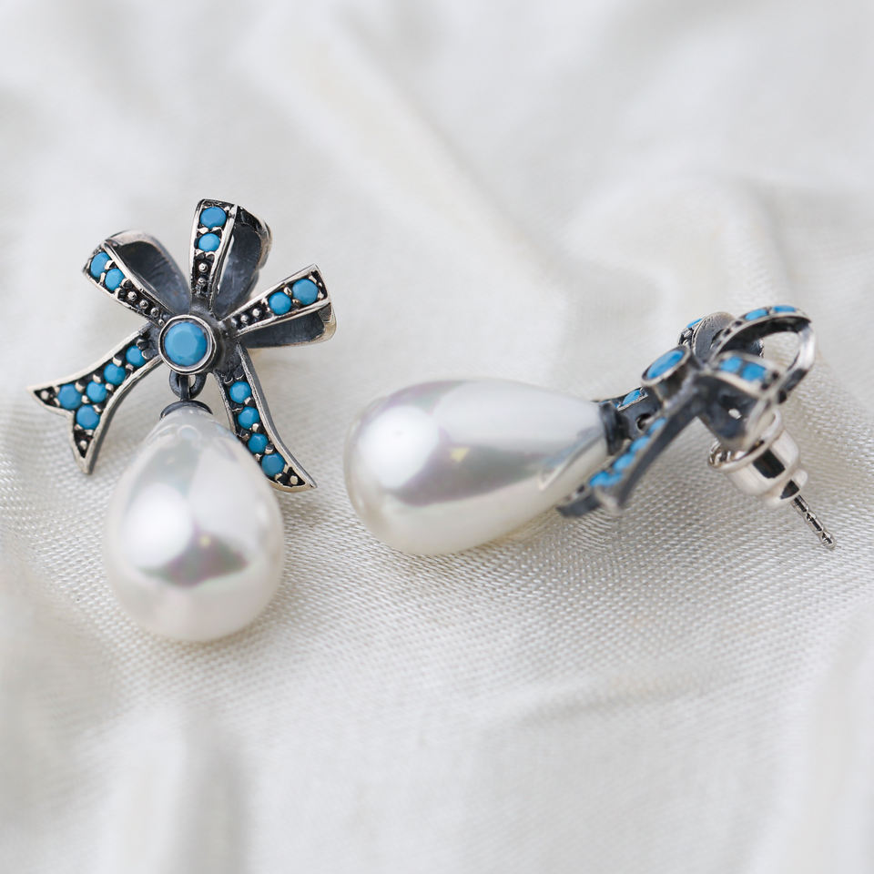 Ribbon Design Elegant Pearl Charm Oxidized Stud Earrings Turquoise Stone Turkish Silver Jewelry Trendy Fine Jewellery