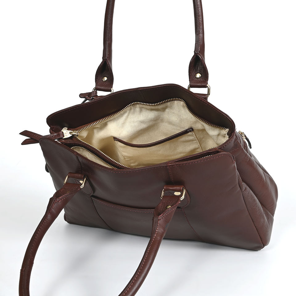 Rich Brown Full Grain Leather Womens Tote Bag with Zippered Compartments and Polished Hardware