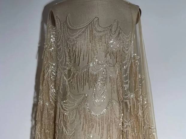 Richly adorned evening lace. Abstract pattern with beaded fringes. High-quality craftsmanship, perfect for evening gowns