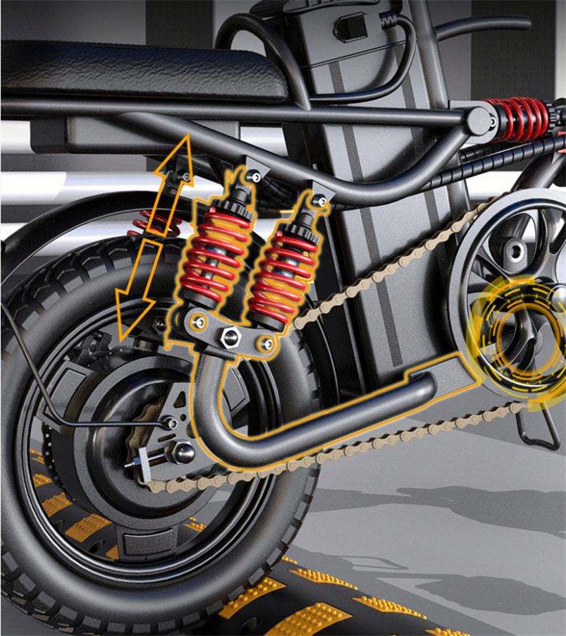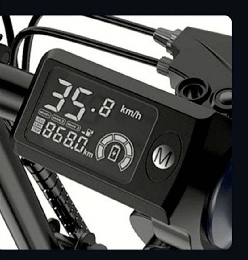 Foldable, pedal assist, fat tires, Disc Brakes, Usb Charging, Led Display, Shock Absorption, Removable Battery, lightweight frame, Adjustable Seat, rear rackFeature