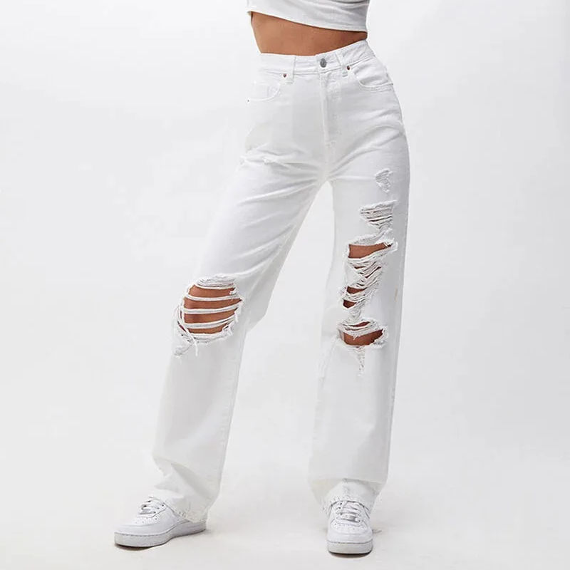 Ripped Hole Distressed Women White Denim Jeans Trendy Straight Fit Lady Trousers Jeans Washed Denim Cargo Pants for Women