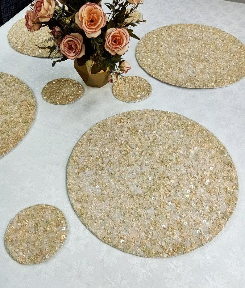 Rizz International Woven Glass Beads Non-Slip Round Golden Placemat for Dining Table Large Size