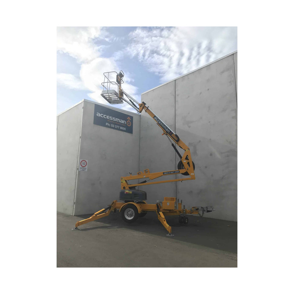 Road-Ready Cherry Picker Trailer with Electric Winch, Towing Lights, and Stabilizers for Quick Setup