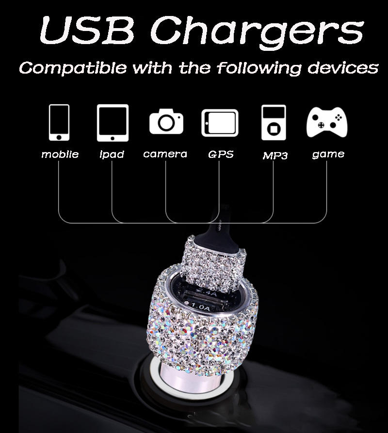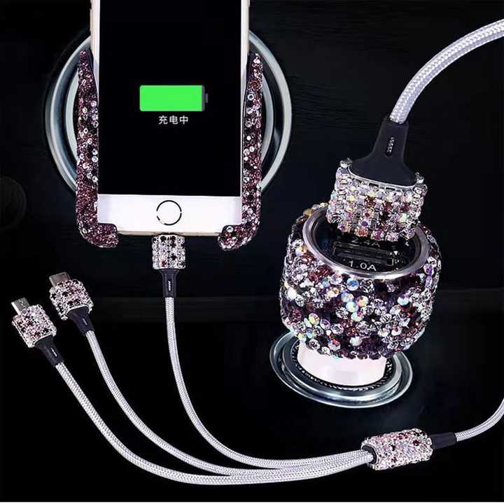 Roadstar Car Charger Accessories Set Rhinestone Dual USB Car Chargers 3 in 1 Nylon Braided Charging Cable Crystal Car Decoration
