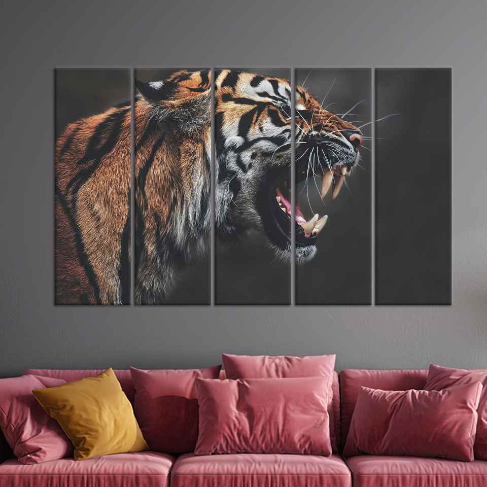 Roaring Tiger Canvas Wall Art: Fierce Jungle Decor,SET OF 5 CANVAS