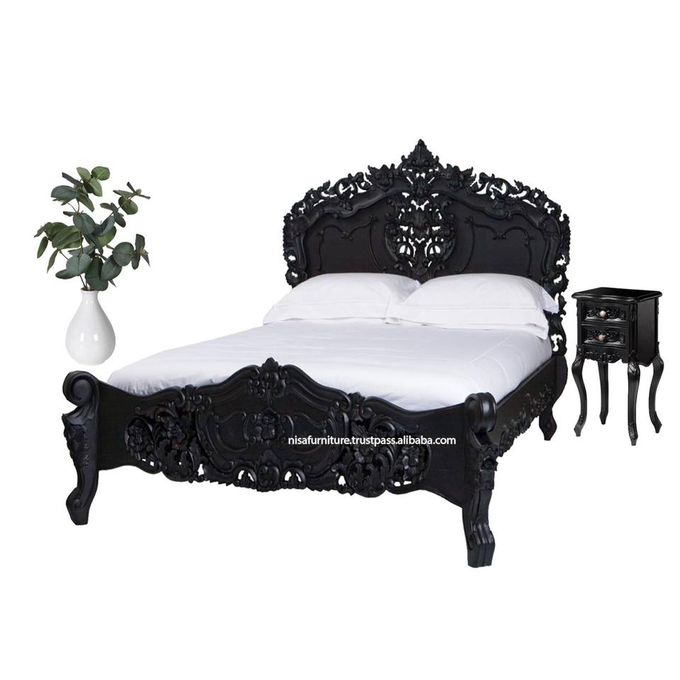 Rococo Black Beds French Style Solid Mahogany Wood Artistic Carved Bedroom Furniture Antique European Design King Size Bed Frame
