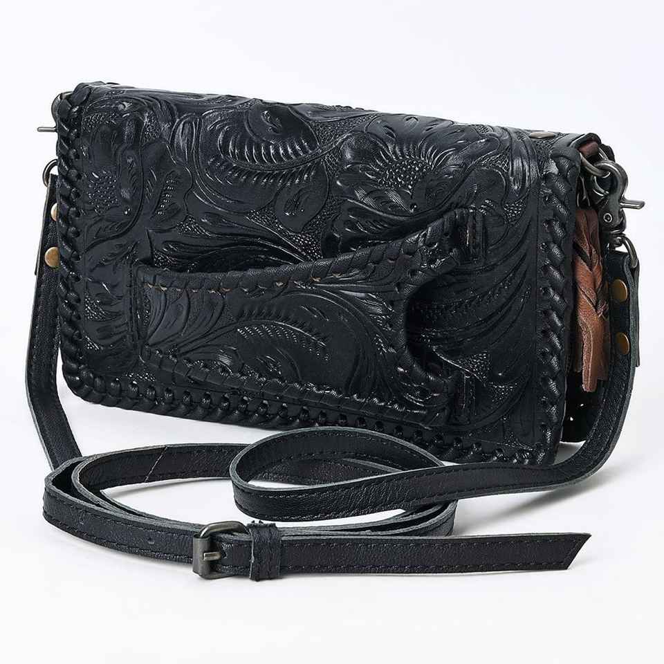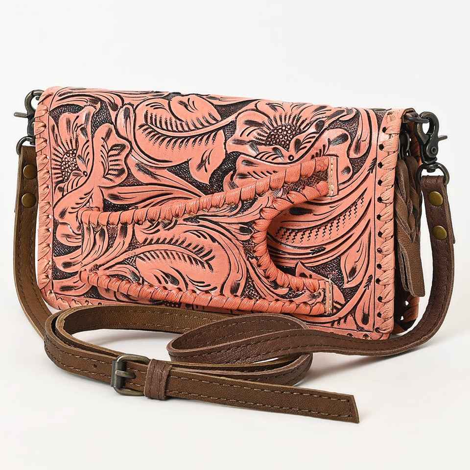 Rodeo Style Tooled Leather Sling Bag With Handle Fashionable Boot Stitched Western Crossbody Bag With Hand Tooling Design