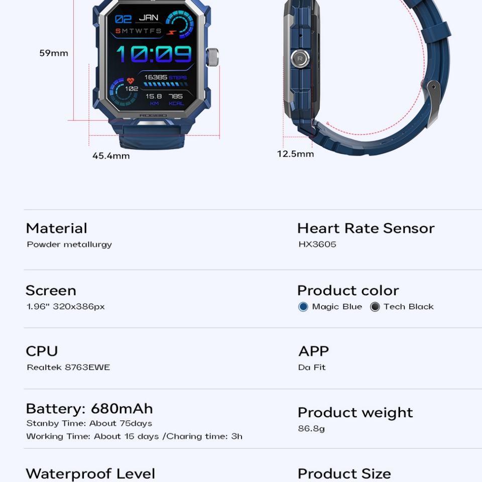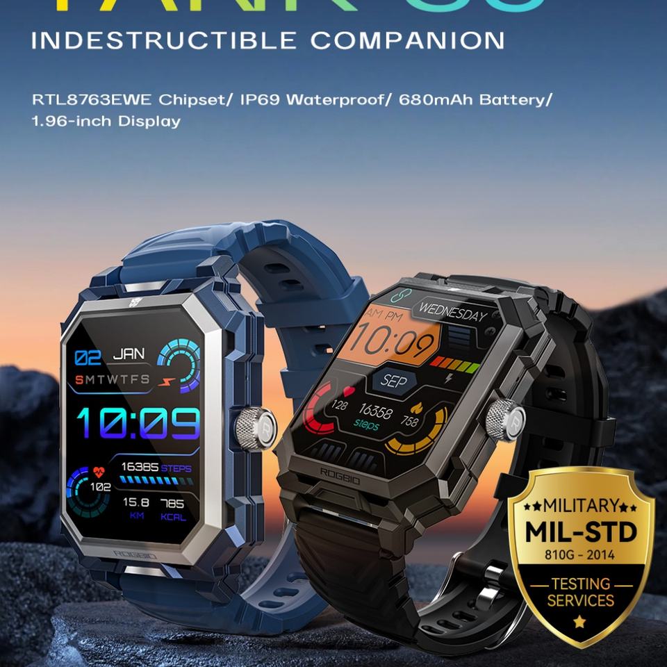 Rogbid Rugged Smartwatch Tank S3 IP69 Waterproof Health Track 1.96" IPS Screen 320*386 680mAh Blood Oxygen Test Sport Watch