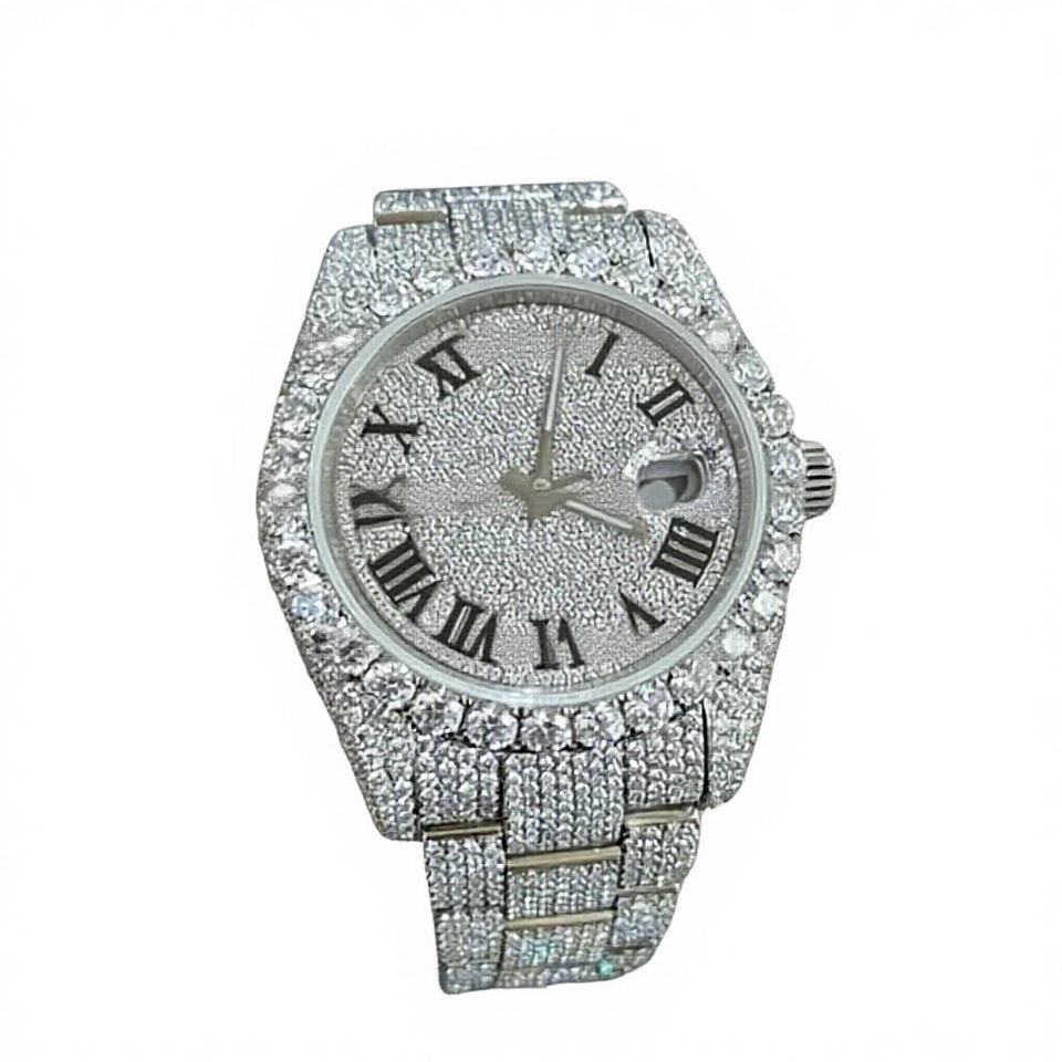 Roman Dial Stainless Steel Glass Band and Bezel Mens Iced Out Diamond 10 Bar Water Resistant Watch