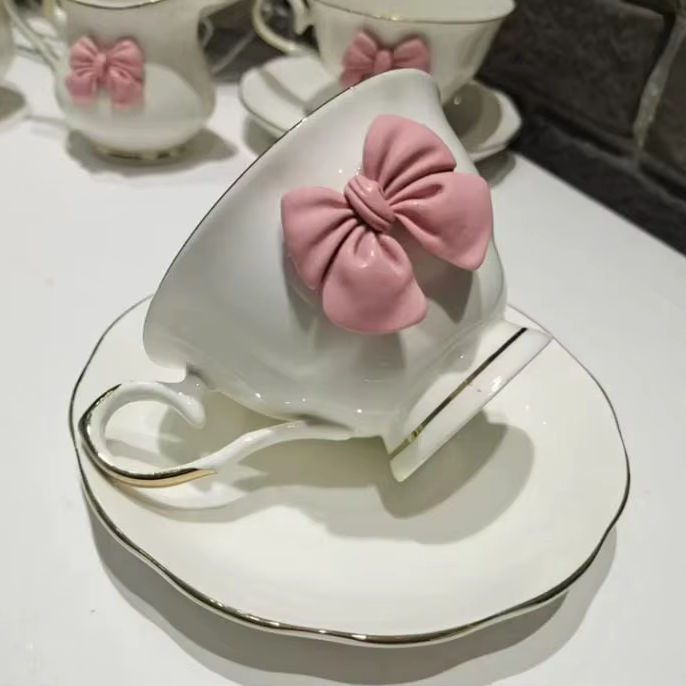 New Vision Romantic Cute Blush Bow Porcelain Teacup Heirloom Collection Durable Eco-Friendly Pink Bow & Gold Trim Tea Set 220ML