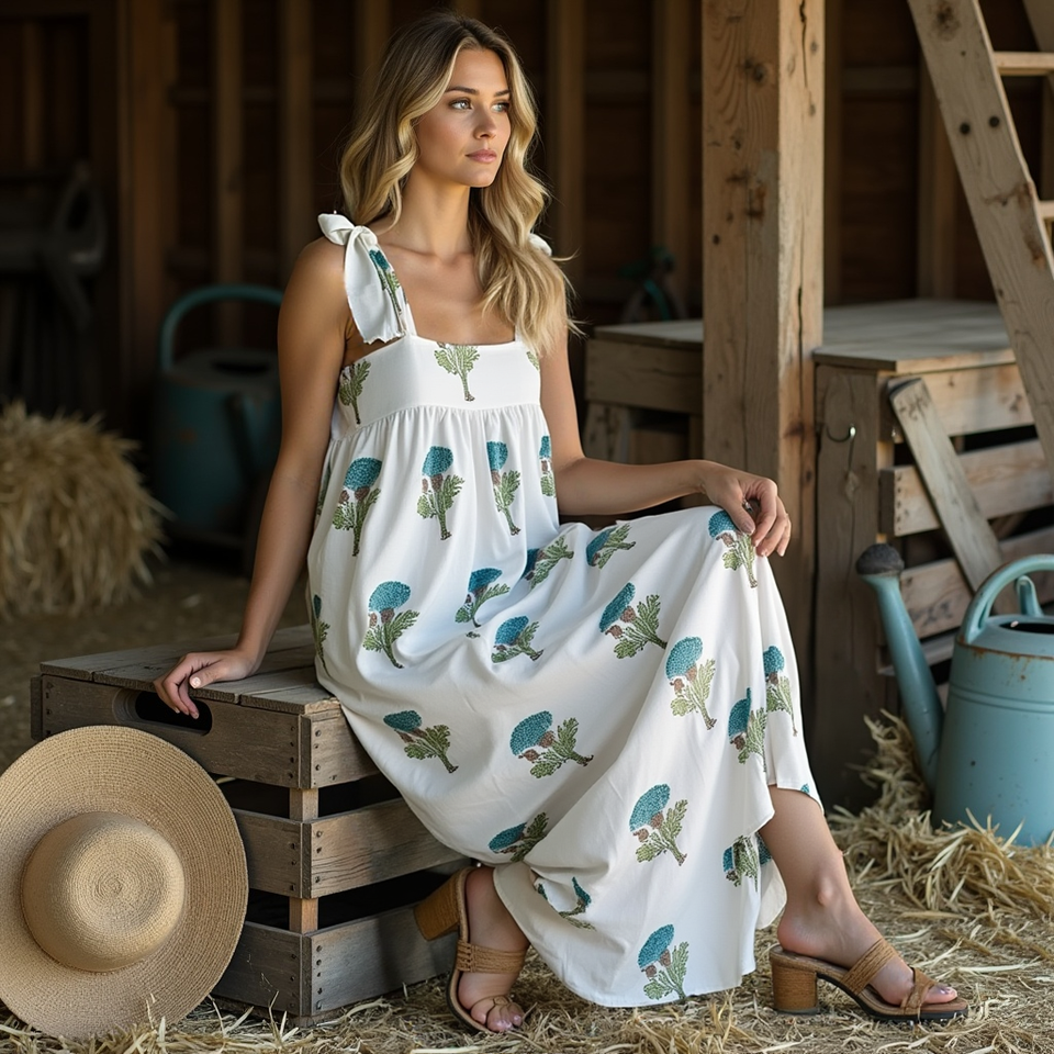 Romantic Boho Floral Pattern Maxi Dress Sleeveless with Green and Blue Hues Soft Square Shoulders and Tie Straps Casual Style