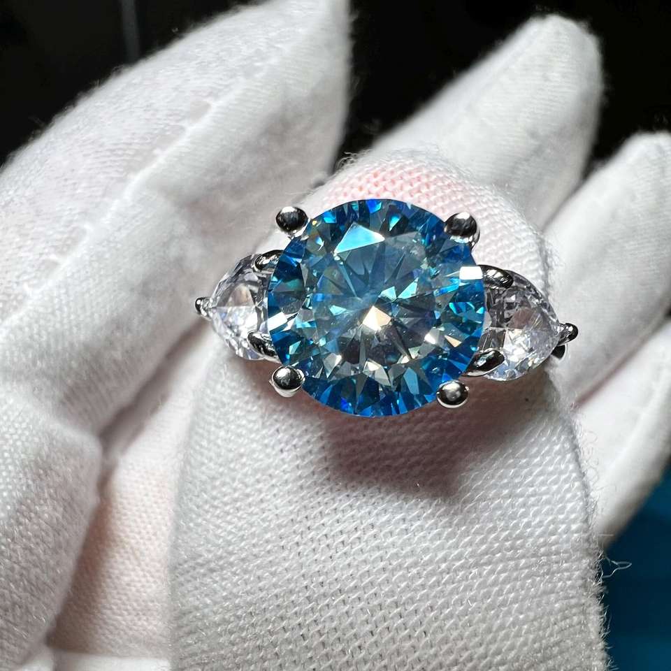 Romantic Original 925 Sterling Silver Three Stone Ring with Intense Blue Brilliant Cut Moissanite for Birthday Gift for Her
