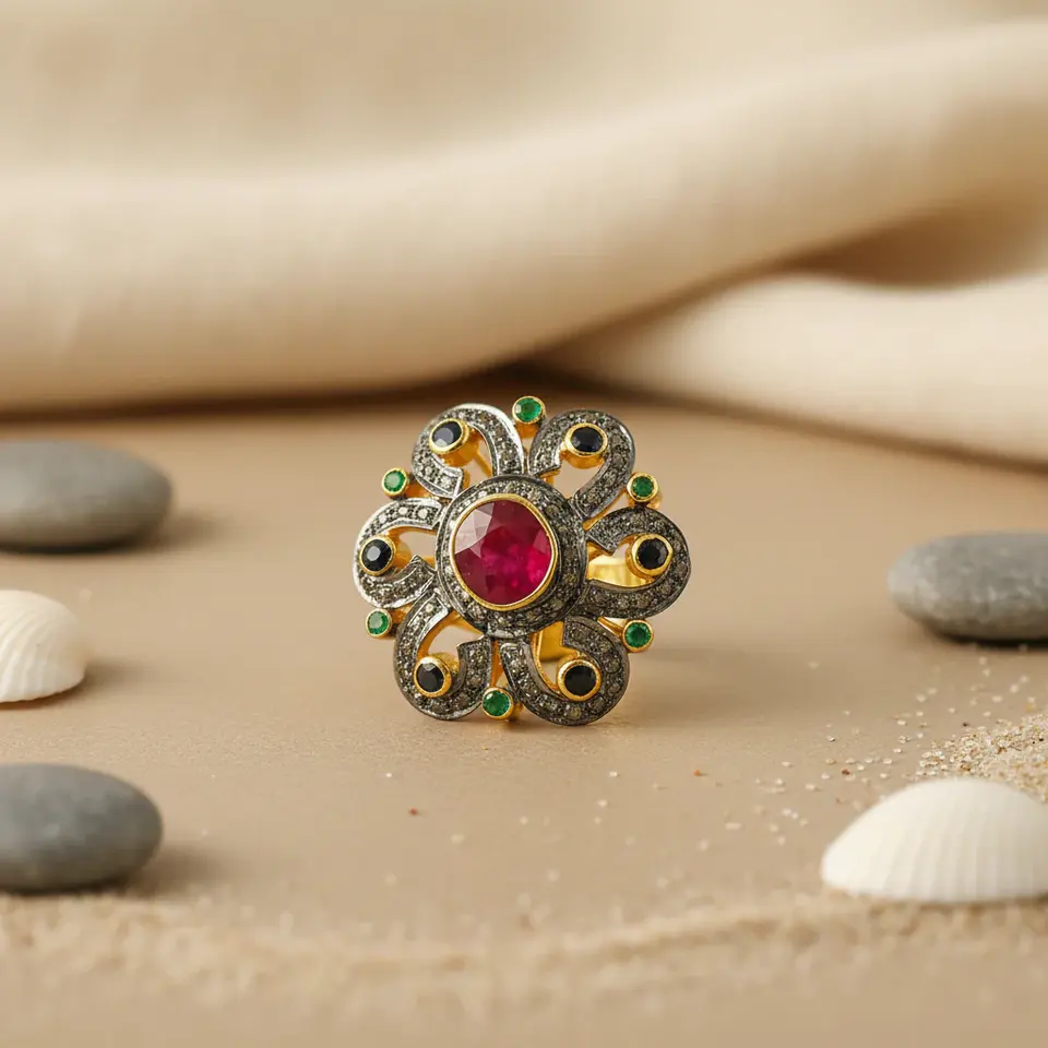 Romantic Rose Gold-Plated Ruby & Emerald Adjustable Ring for Women Trendy Inlay Style with Oval Cut Diamond Flower Design