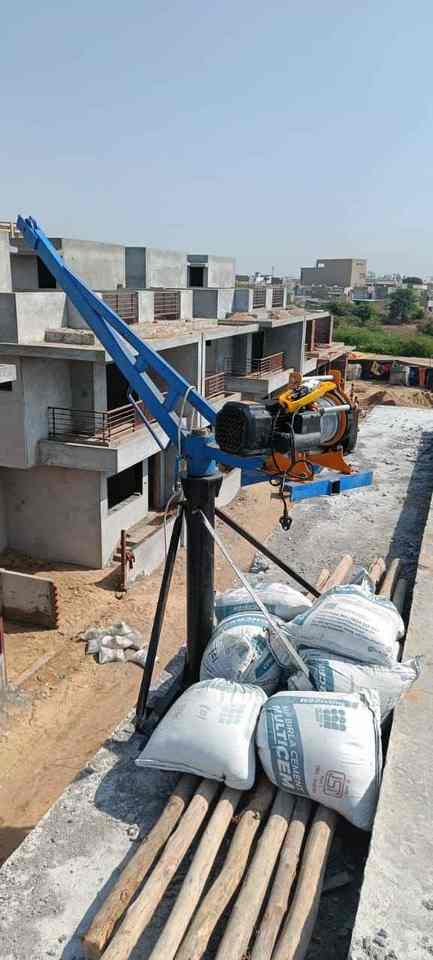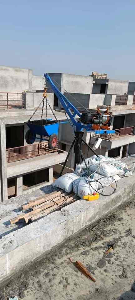 Rooftop jib crane with electric hoist lifting construction materials using trolley cart at multi storey building site