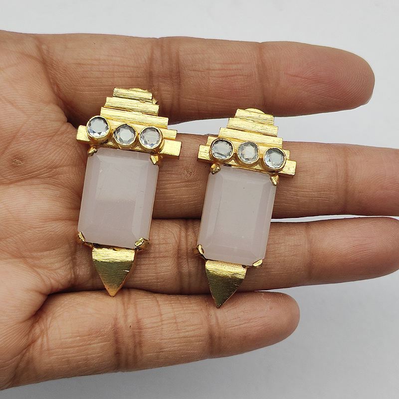 Rose Chalcedony CZ Set Gold Plated Fashion Earrings 14.16 Gms Brass for Women for Party Wedding Christmas Gift-Pink Color Stud