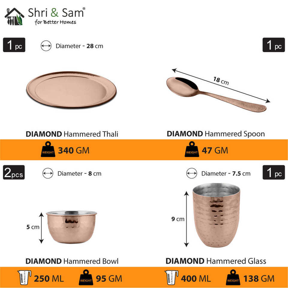 Rose Gold PVD Coated Hammered Stainless Steel Thali Set with Diamond Premium Dinnerware Sets