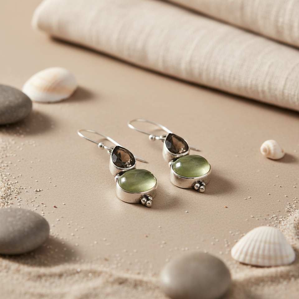 "Rose Gold Plated 925 Sterling Silver Drop Earrings with Prehnite & Smoky Quartz for Women"
