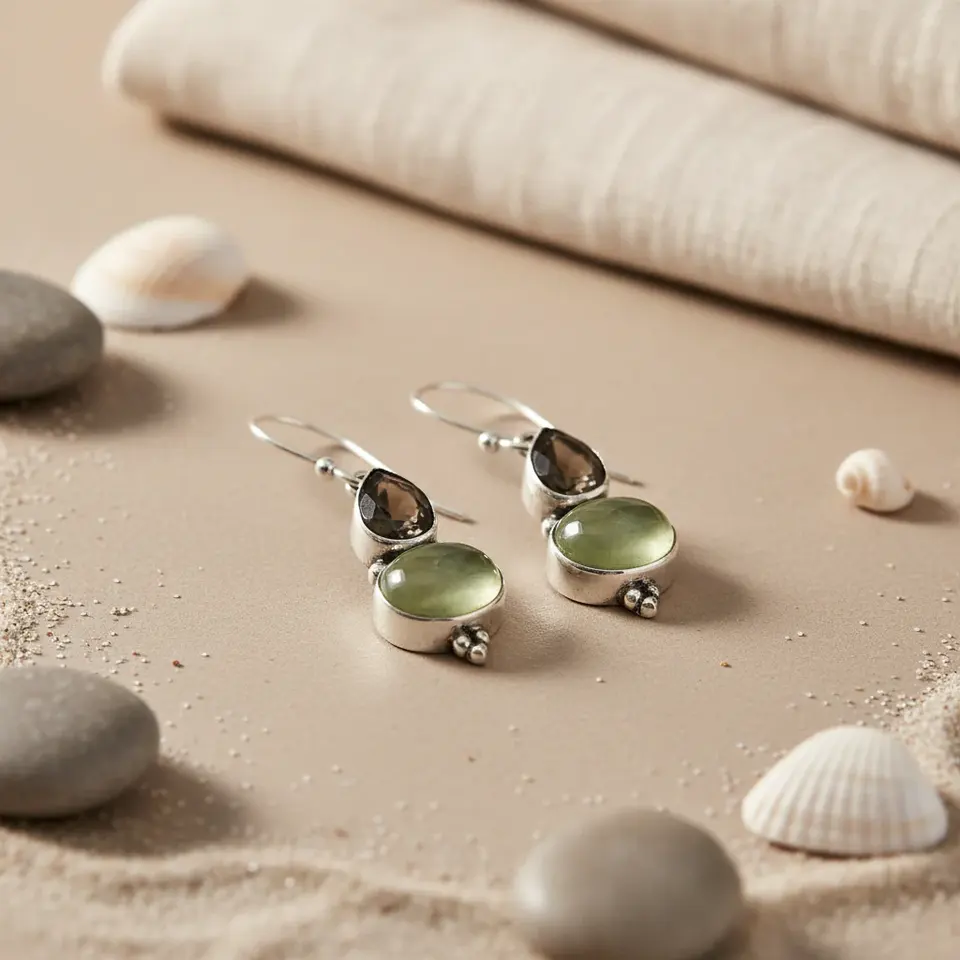 "Rose Gold Plated 925 Sterling Silver Drop Earrings with Prehnite & Smoky Quartz for Women"