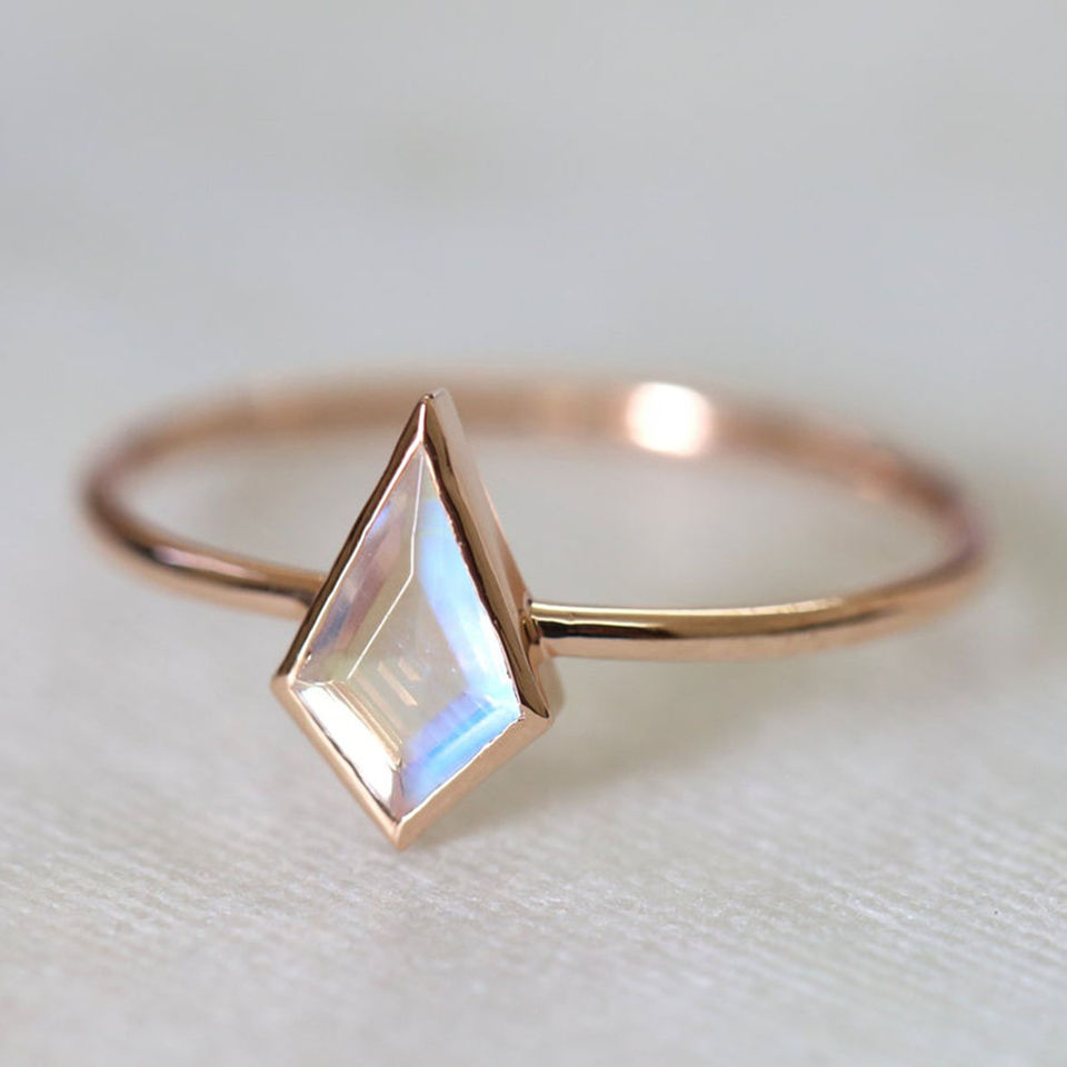 Rose Gold Plating 925 Sterling Silver Basic Bezel Blue Moonstone Jewelry Kite Rainbow Moonstone Engagement Ring