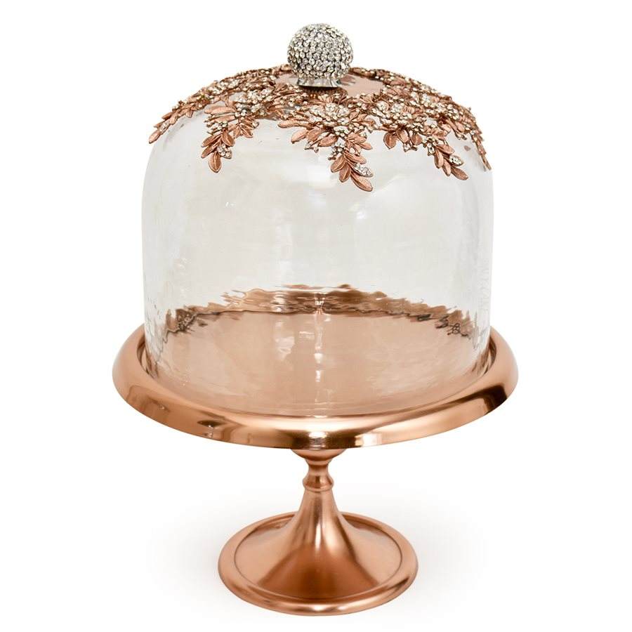 Rose Gold Royal Glass Dome Cake Stand Hand Crafted Diamond Crystal Encrusted Finial & Rim Metal Plate & Base Cake Stand