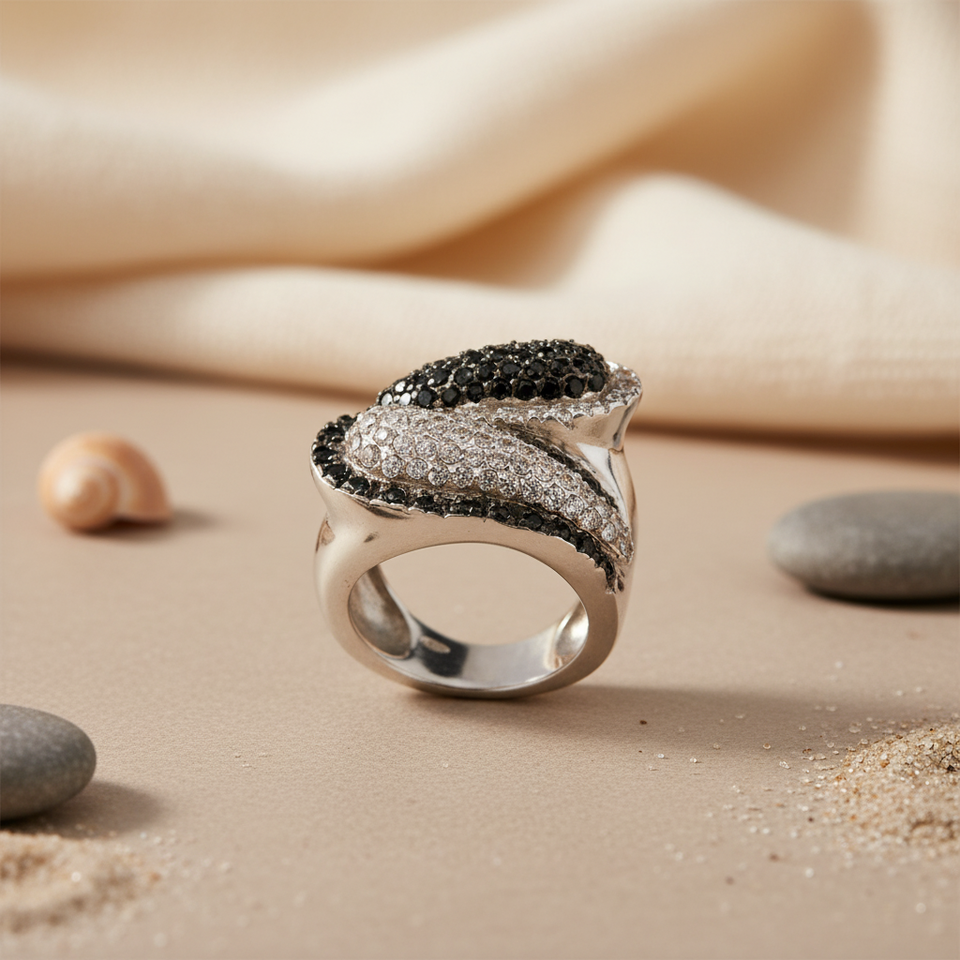 Rose Gold and 18K Plated Silver Ring for Women Fashionable Statement Jewelry with Black Inlay Stones IGI Certified