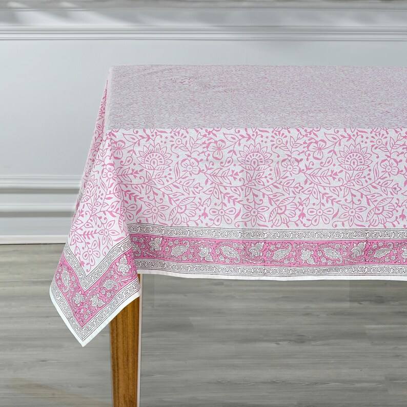 Rose Pink Floral Cotton Table Cloth Hand Block Printed Indian French Country Dining Table Linen For Wedding Home