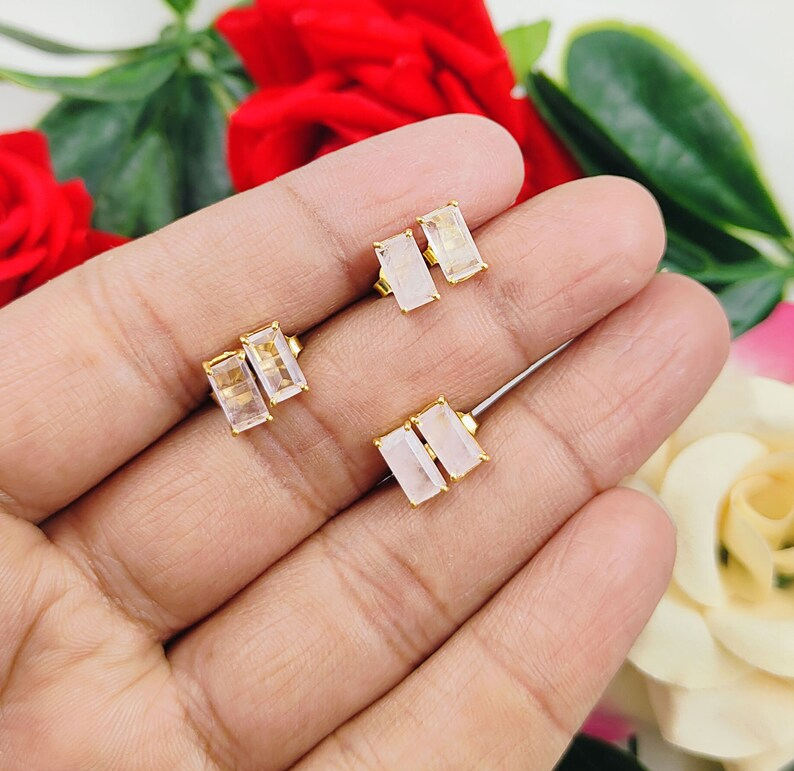 Rose Quartz Birthstone Stud Earring 8x4mm Baguette Cut 18K Gold Vermeil Sterling Silver Prong Set 100% Gold Plated