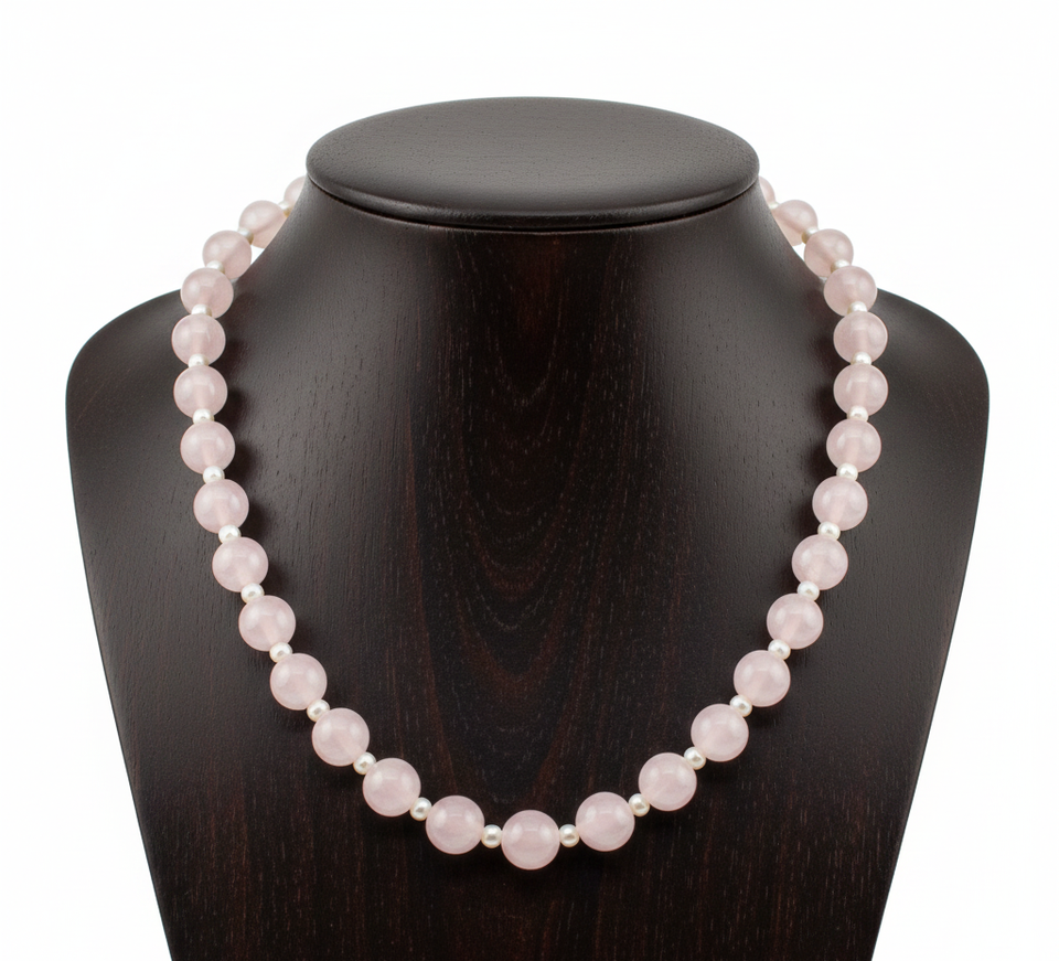 Rose Quartz Geometric Beaded Necklace Unisex 18-Inch Silver 925 Lock Hand Knotted Design Trendy Fashion Jewelry Accessory Gift