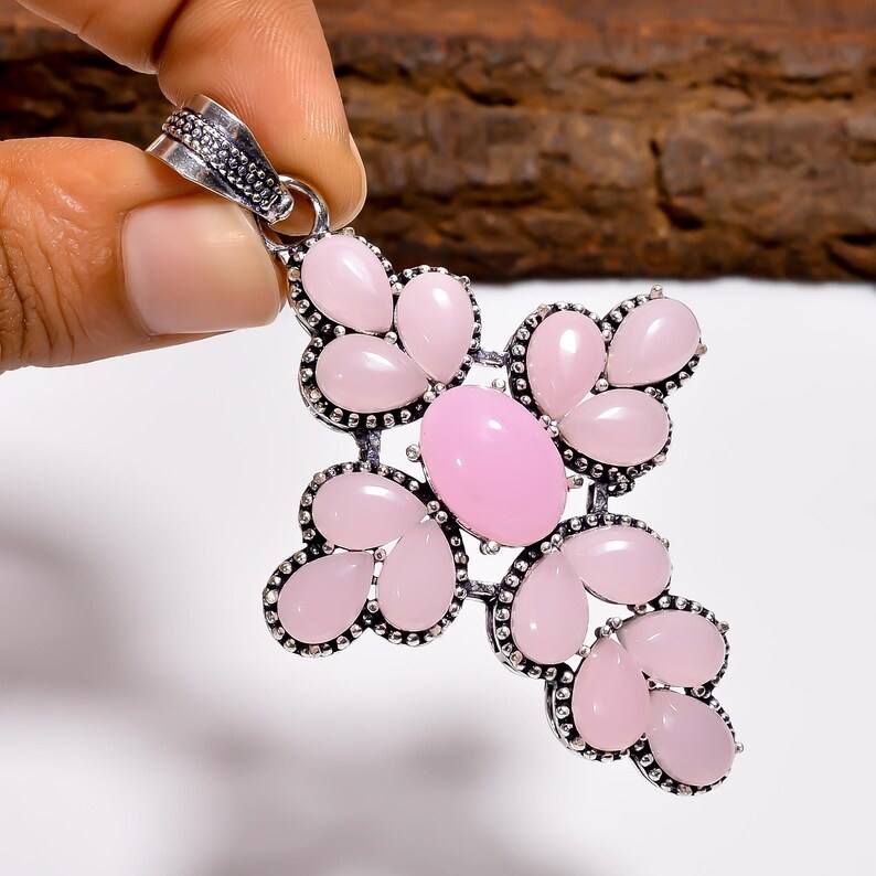 Rose Quartz Multi Stone Pendant Sterling Silver Cross Pink Gemstone Handmade Necklace Healing Love Jewelry Gift For Her