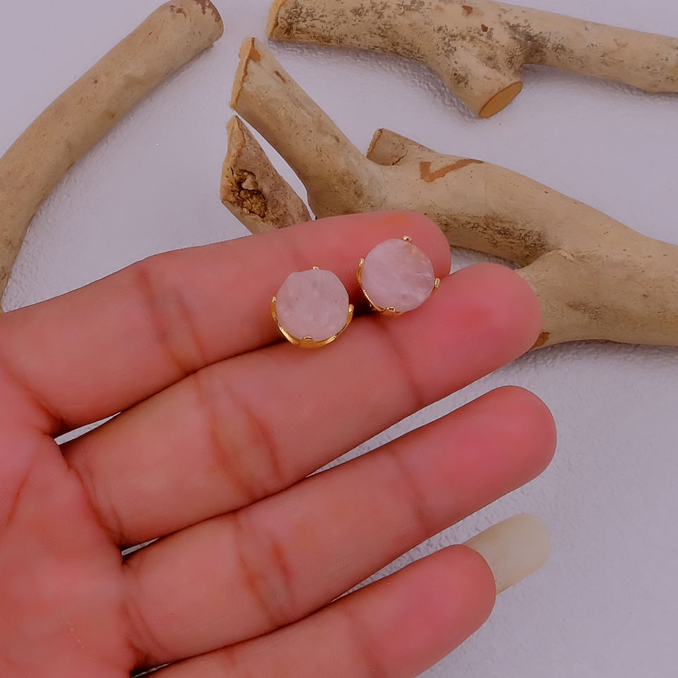Rose Quartz October Birthstone Raw Gemstone Stud Earrings Stainless Steel Gold Plated Claw Setting Trendy Wholesale Handmade