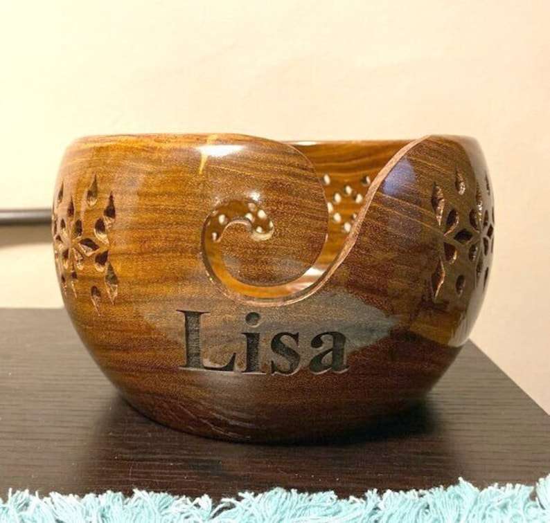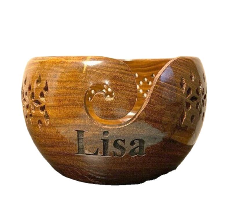 Rosewood Crafted Wooden Yarn Storage Bowl With Carved Holes Drills LARGE 7 Inches X 4 Inches (Thin Clear Coat)