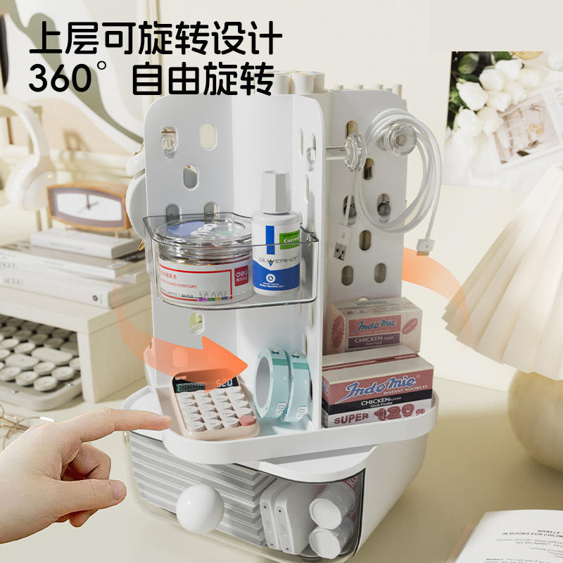 Rotating Desktop Storage Box Pegboard Shelf With Drawer Organizer For Stationery And Toys Cream Color Rectangle Standing Type