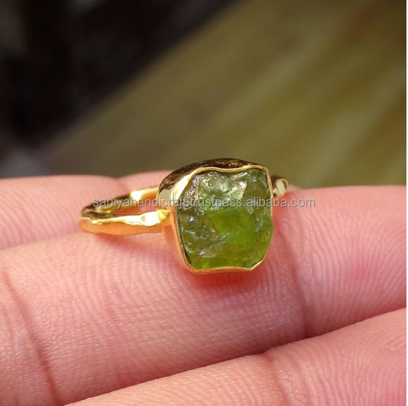Rough Peridot Ring Natural Uncut Gemstone Peridot Ring Brass Gold Plated Ring Ring Bohemian Jewelry Boho Ring Celestial Jewelry