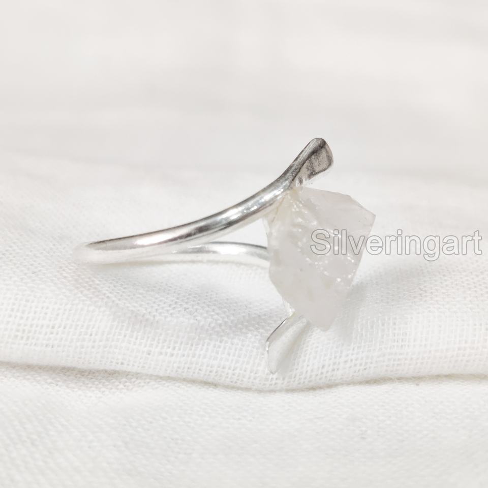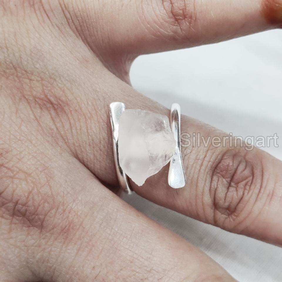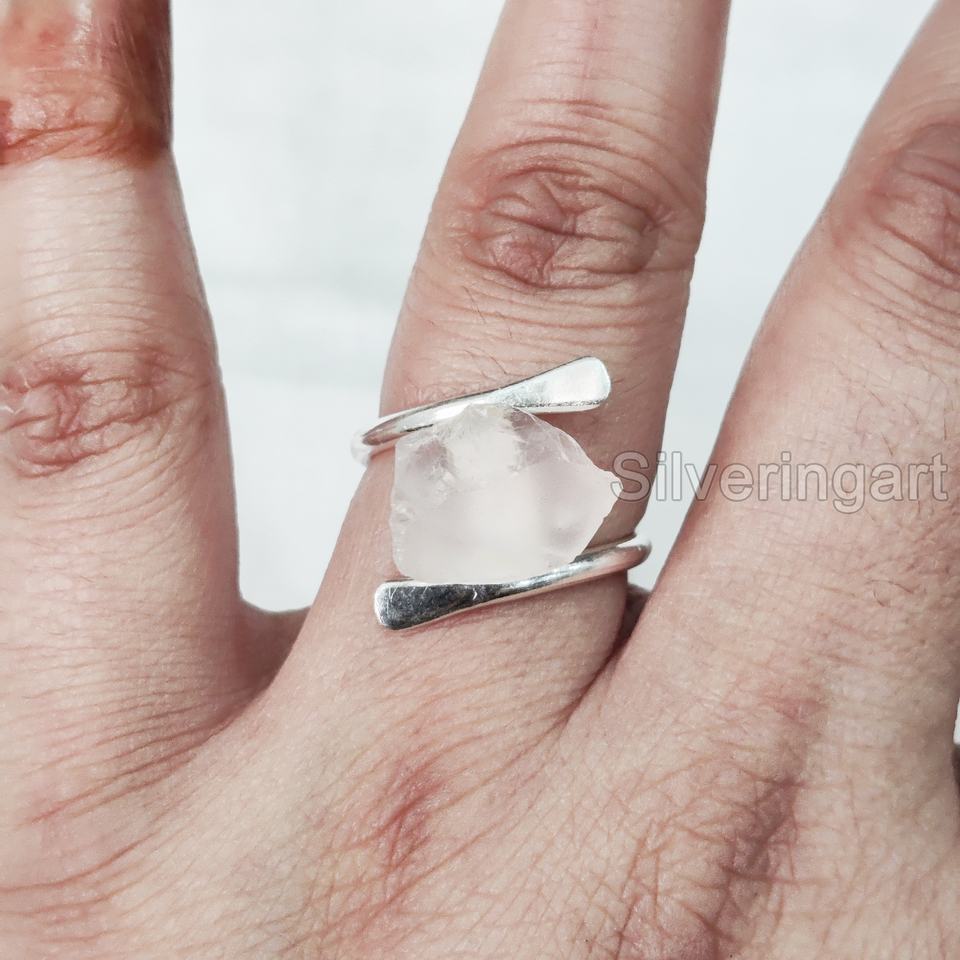 Rough Stone Jewelry Women's Ring Natural Raw Rose Quartz Gemstone April Birthstone Cross Band Wedding 925 Sterling Silver Ring