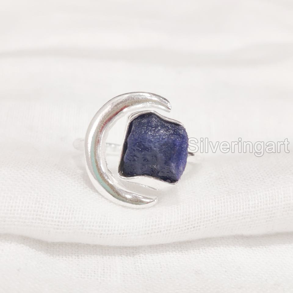 Rough Stone Jewelry Women's Ring Natural Raw Blue Sapphire Gemstone September Birthstone Crescent Moon 925 Sterling Silver Ring