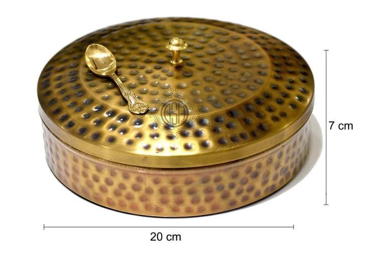 Round Brass Masala Dabba With Lid & Inner Containers Handmade Spice Box For Kitchen Hotel Restaurant Use With Hammerd Design