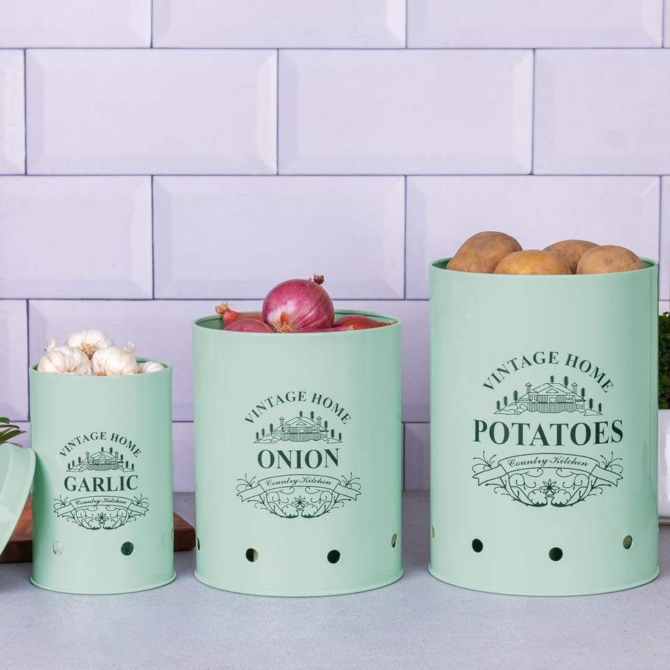 Round Classic Kitchen Storage Containers Set of 3 Metal Jars With Lid Potato, Onion & Garlic Food Safe