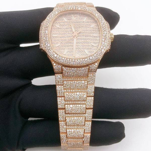 Round Cut Colorless Moissanite Diamond Watch In Rose Gold Tone Hip Hop Fully Iced Out Automatic Watch At Low Price